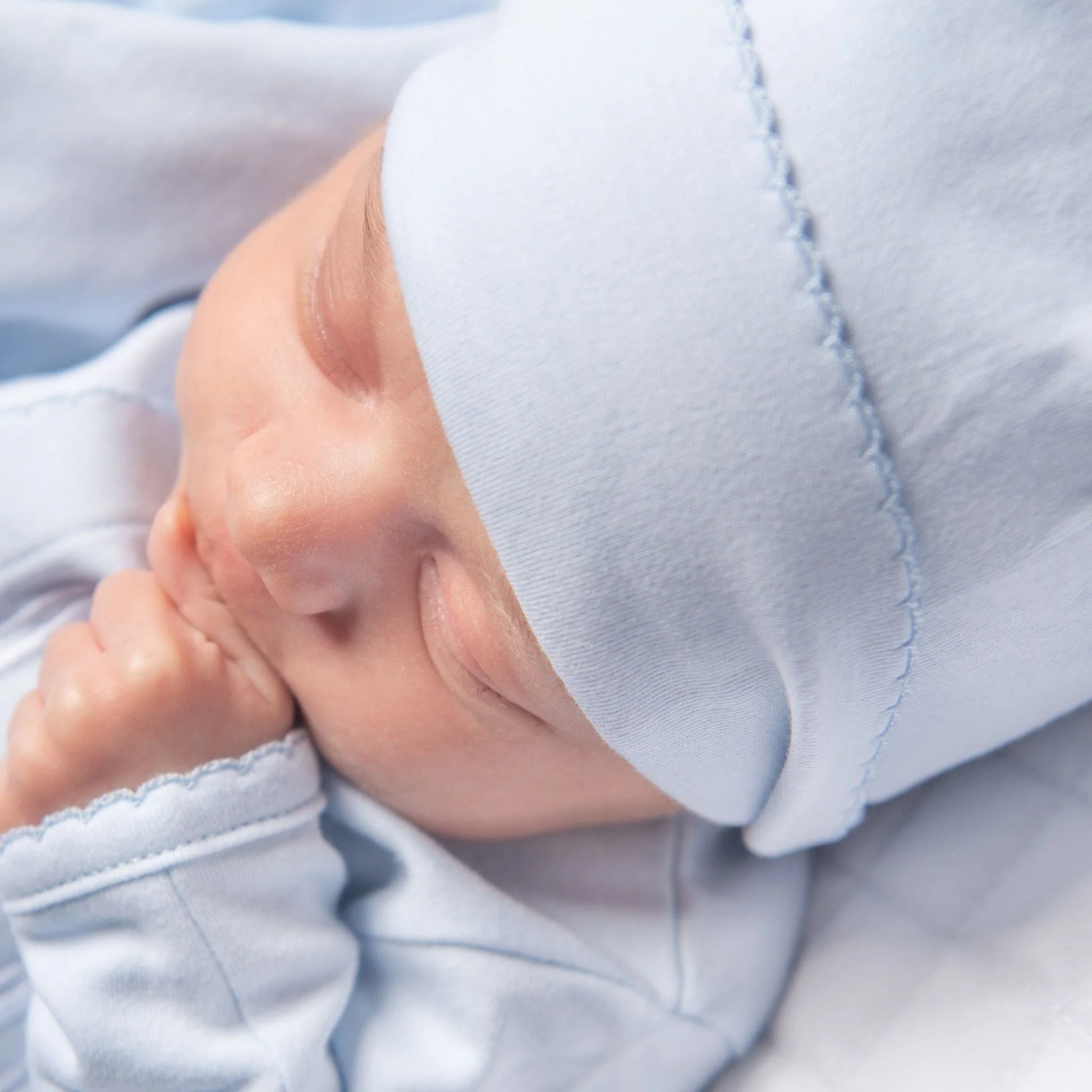 Indulge your little one's layette with this sophisticated light blue Pima cotton hat. Not only will it keep your baby warm, but it also makes for a timeless keepsake when personalized with a monogram. Match it with our luxurious essentials for the perfect take me home set.