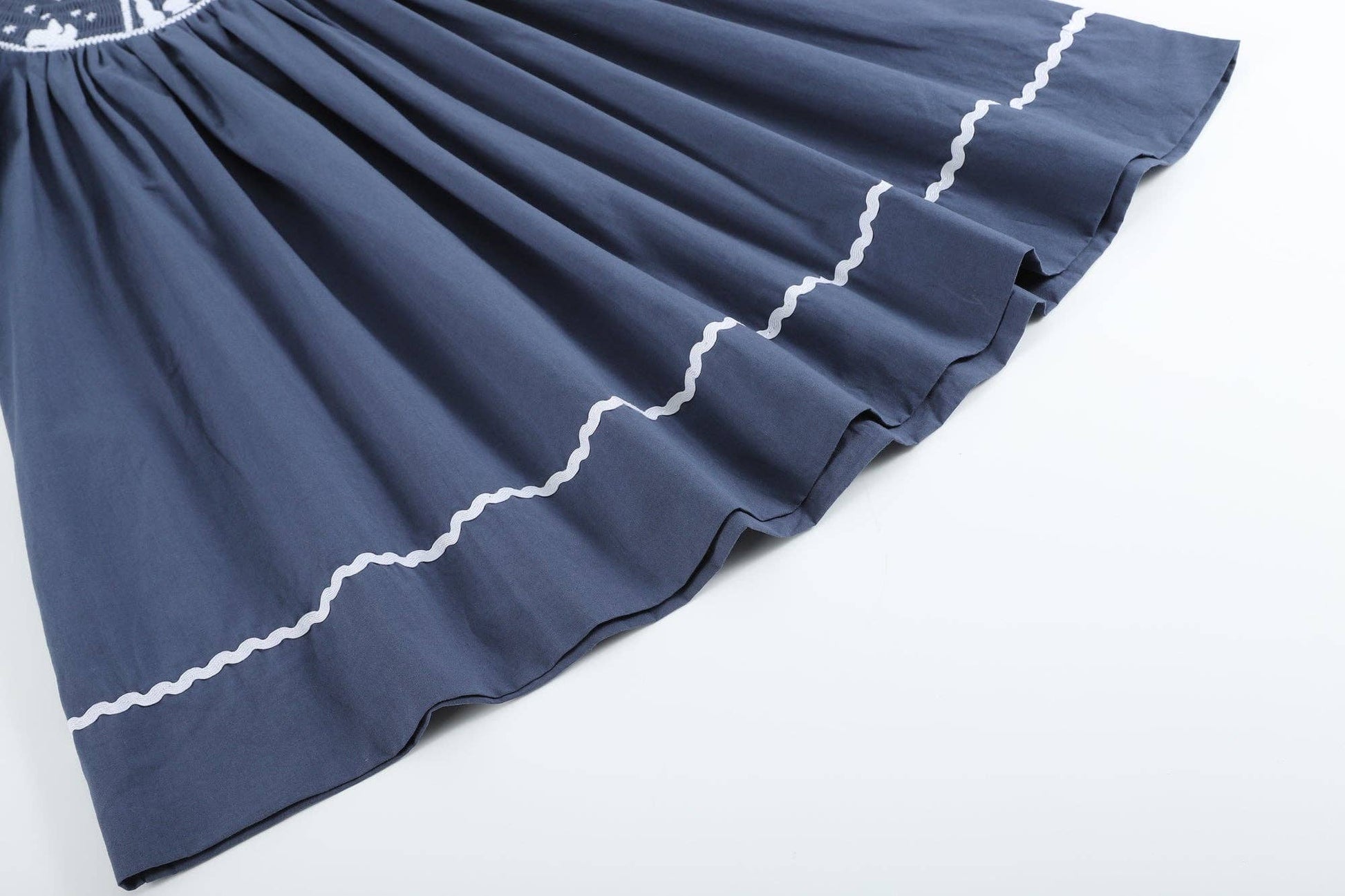 Stunning and Sweet! This beautiful navy blue dress by Lil Cactus features pretty nativity embroidery, long sleeves, white trim, and smocking. Made in 100% soft cotton ensure your little sweetie is comfortable all day long. This Bishop dress is the traditional length with a hemline reaching the calf/ankle. A stunning outfit for your cutie and all of her Christmas fun. From twirling and dancing the day away to church service with your family; no matter the occasion she will be looking picture-perfect!
