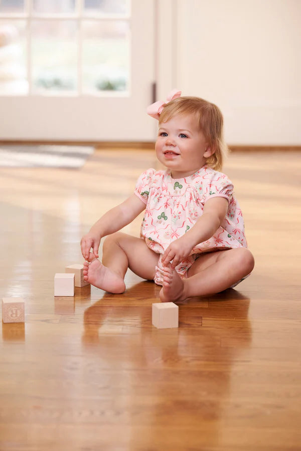 Capture hearts with our Blythe Bubble featuring the elegant Boxwoods & Bows print beautifully accented with Palm Beach Pink trim, designed with a sweet bubble silhouette perfect for your little one. Expertly crafted from premium fabric with charming details and a comfortable fit, this adorable one-piece is ideal for creating cherished memories. A timeless wardrobe favorite that brings classic elegance and effortless style to every celebration.