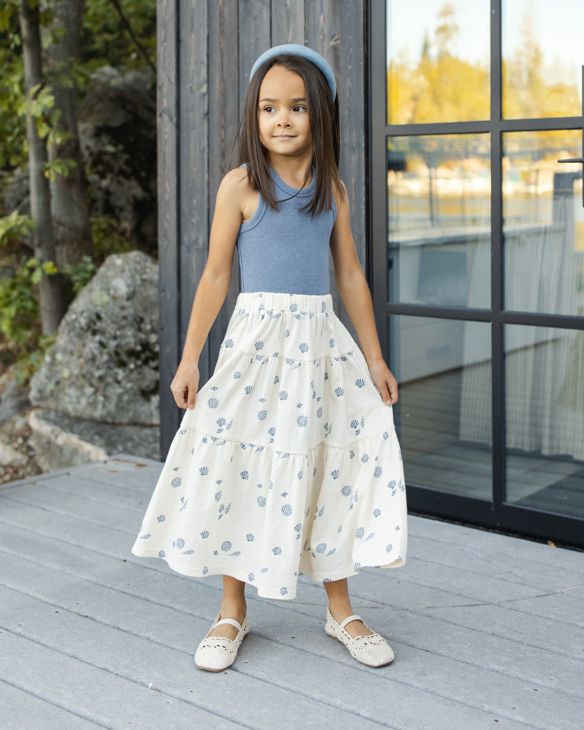 This cotton jersey midi skirt has three flowing tiers, an elastic waistband, and all the flowy fun.
